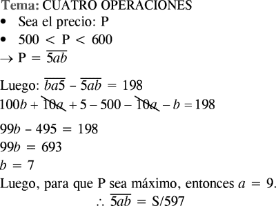 Se compra un producto cuyo precio es mayor que S/.500, pero menor que S/600. Al pagar por el producto, la cajera, por error, digitó el precio del producto invirtiendo el orden de sus cifras y, debido a este error, el precio se incremento en S/.198. ¿Cuál es el precio del producto si se sabe que es el máximo posible?